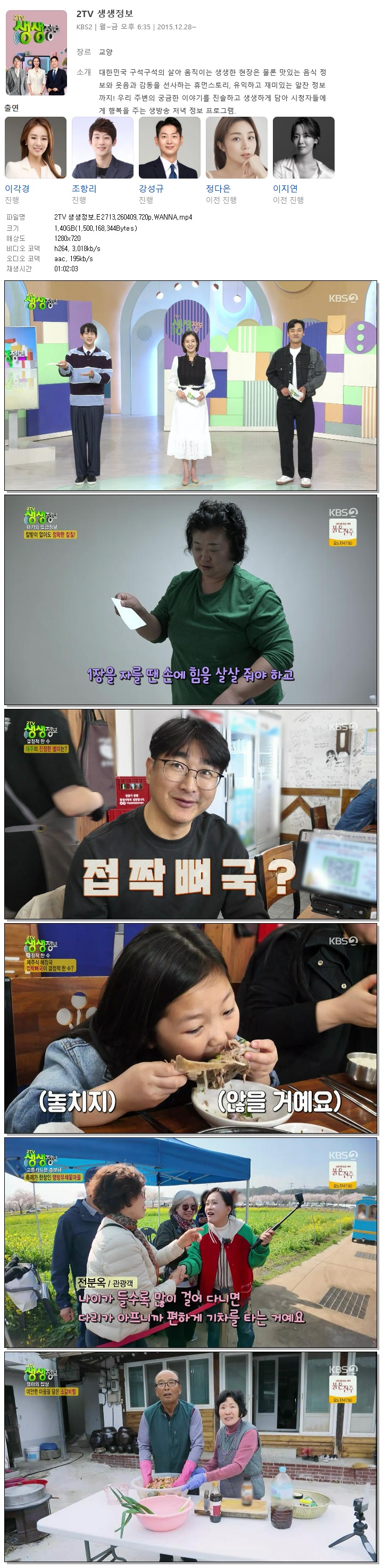 | [KBS2] 2TV 생생정보.E2713.260409.720p.WANNA[이각경, 조항리].mp4 | 1.4 G | 01:02:03 | 1280x720 |
