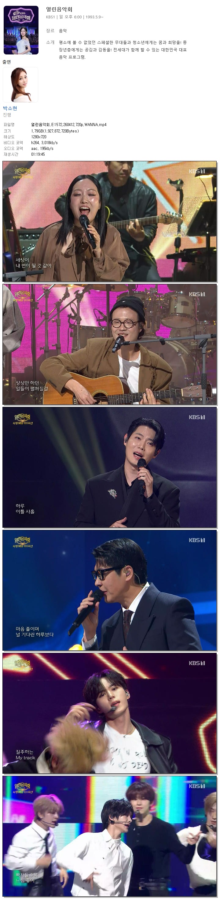 | [KBS1] 열린음악회.E1572.260412.720p.WANNA[정인, 포레스텔라].mp4 | 1.8 G | 01:19:45 | 1280x720 |