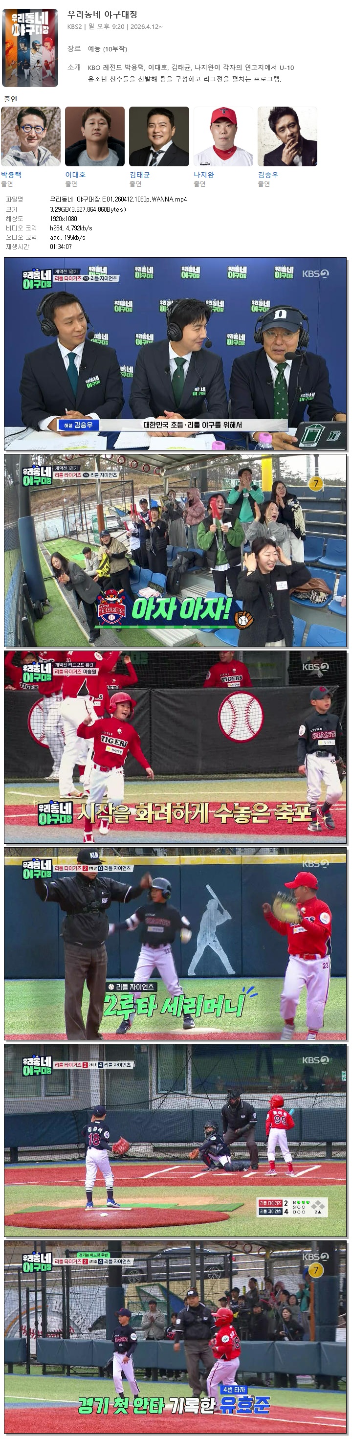 [KBS2] 우리동네 야구대장.E01.260412.1080p.WANNA[이대호, 김태균] 다시보기 토렌트