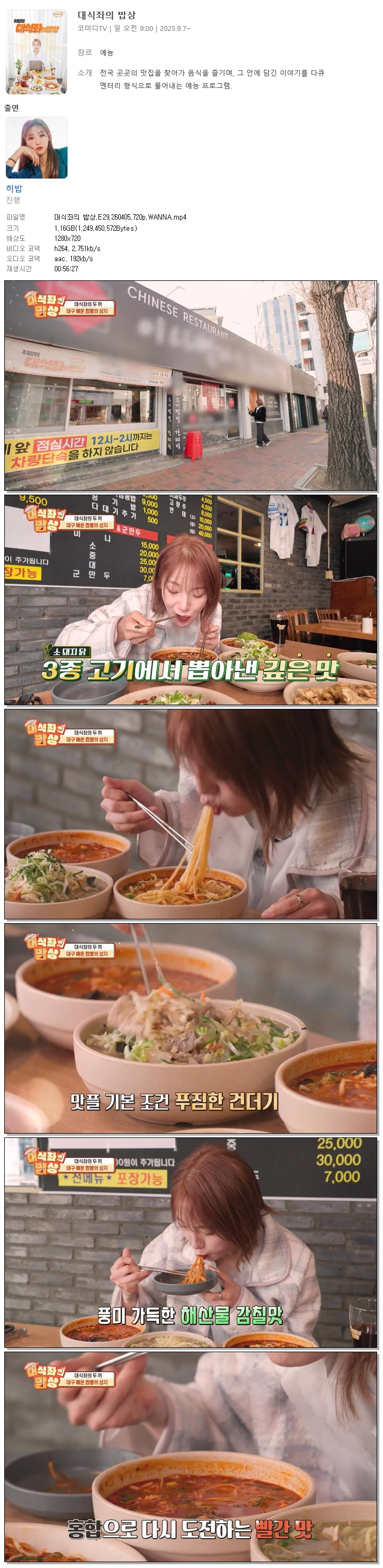 | [코미디TV] 대식좌의 밥상.E29.260405.720p.WANNA[히밥].mp4 | 1.2 G | 00:56:27 | 1280x720 |