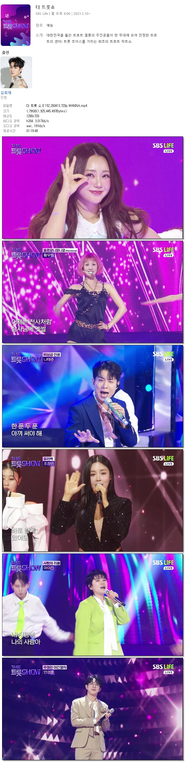 | [SBS LIFE] 더 트롯 쇼.E152.260413.720p.WANNA[홍지윤, 송가인].mp4 | 1.8 G | 01:19:48 | 1280x720 |