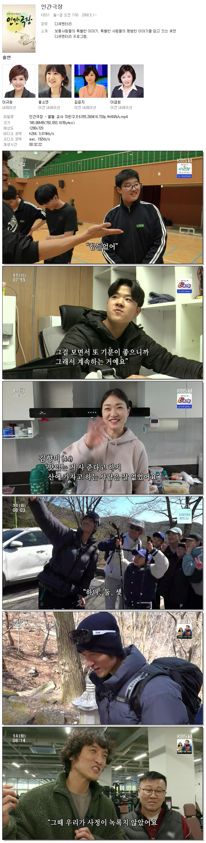 | [KBS1] 인간극장.E6355.260414.720p.WANNA.mp4 | 745.9 M | 00:32:22 | 1280x720 |