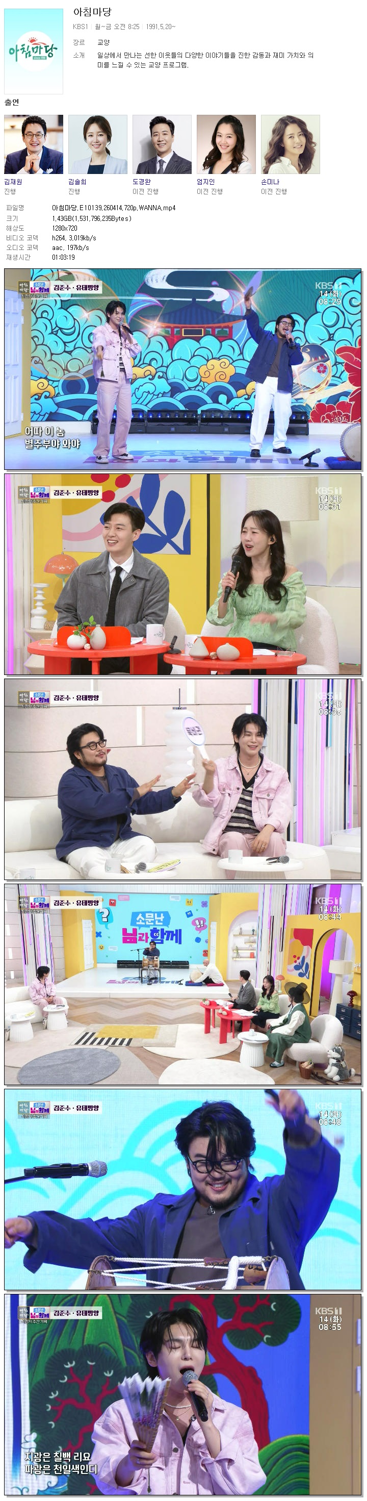| [KBS1] 아침마당.E10139.260414.720p.WANNA[엄지인, 박철규].mp4 | 1.4 G | 01:03:19 | 1280x720 |