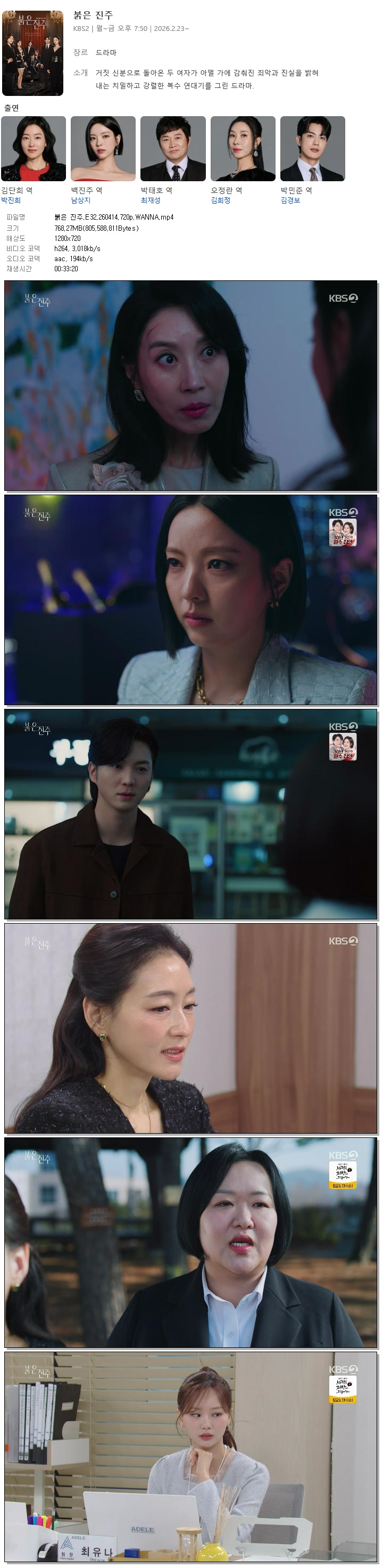 | [KBS2] 붉은 진주.E32.260414.720p.WANNA[박진희, 남상지].mp4 | 768.3 M | 00:33:20 | 1280x720 |