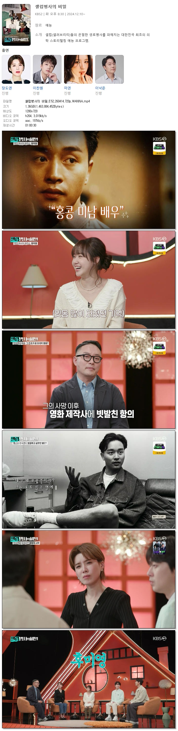 | [KBS2] 셀럽병사의 비밀.E52.260414.720p.WANNA[장도연, 이찬원].mp4 | 1.4 G | 01:00:30 | 1280x720 |