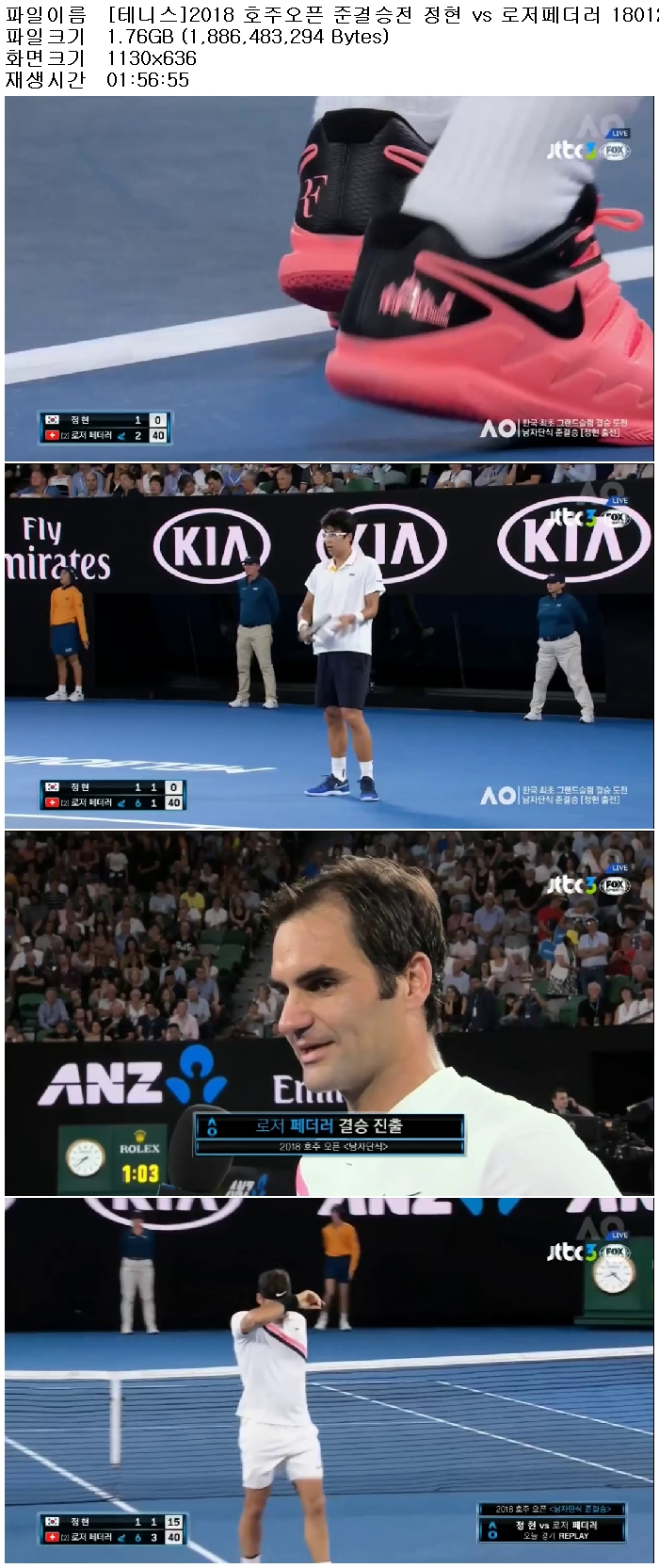 [테니스]2018 호주오픈 준결승전 정현 vs 로저페더러 180126 [국내방송].avi 1.8 G 01:56:55 1130x636