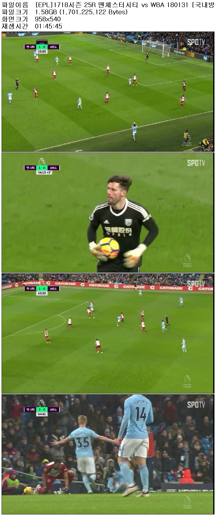 | [EPL]1718시즌 25R 맨체스터시티 vs WBA 180131 [국내방송].avi | 1.6 G | 01:45:45 | 958x540 |