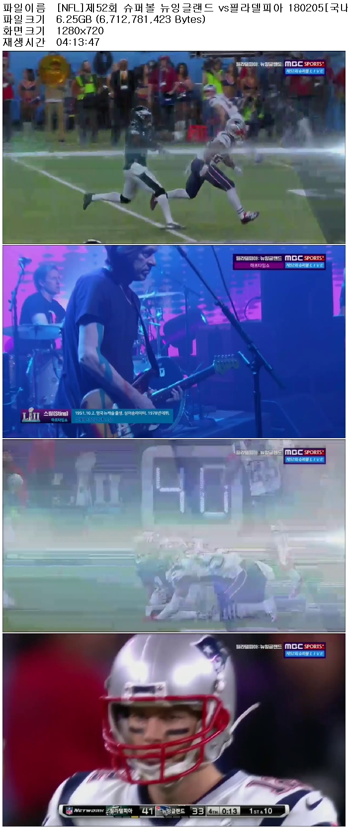 | [NFL]제52회 슈퍼볼 뉴잉글랜드 vs필라델피아 180205[국내방송,고화질,720P].mp4 | 6.3 G | 04:13:47 | 1280x720 |