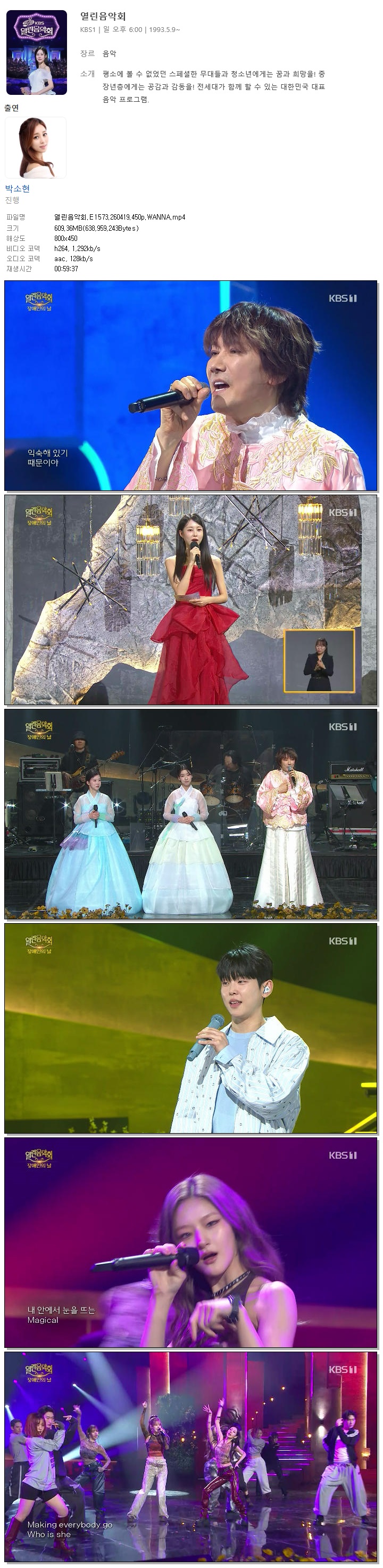 | [KBS1] 열린음악회.E1573.260419.450p.WANNA[김장훈, 서영은].mp4 | 609.4 M | 00:59:37 | 800x450 |
