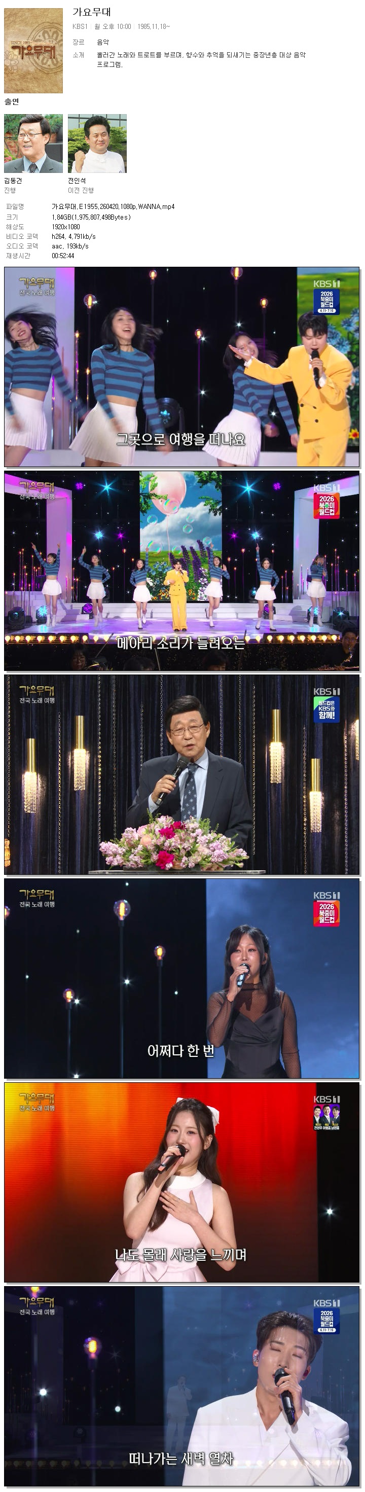 | [KBS1] 가요무대.E1955.260420.1080p.WANNA[천록담, 춘길].mp4 | 1.8 G | 00:52:44 | 1920x1080 |