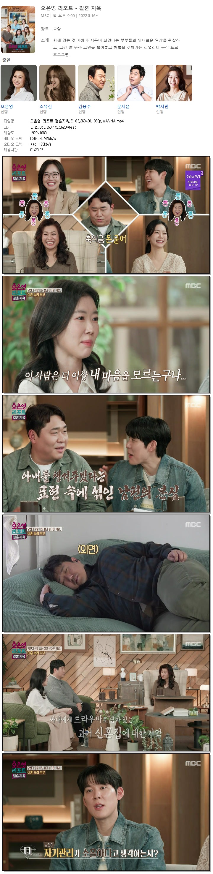 | [MBC] 오은영 리포트 결혼지옥.E163.260420.1080p.WANNA[오은영, 문세윤].mp4 | 3.1 G | 01:29:26 | 1920x1080 |