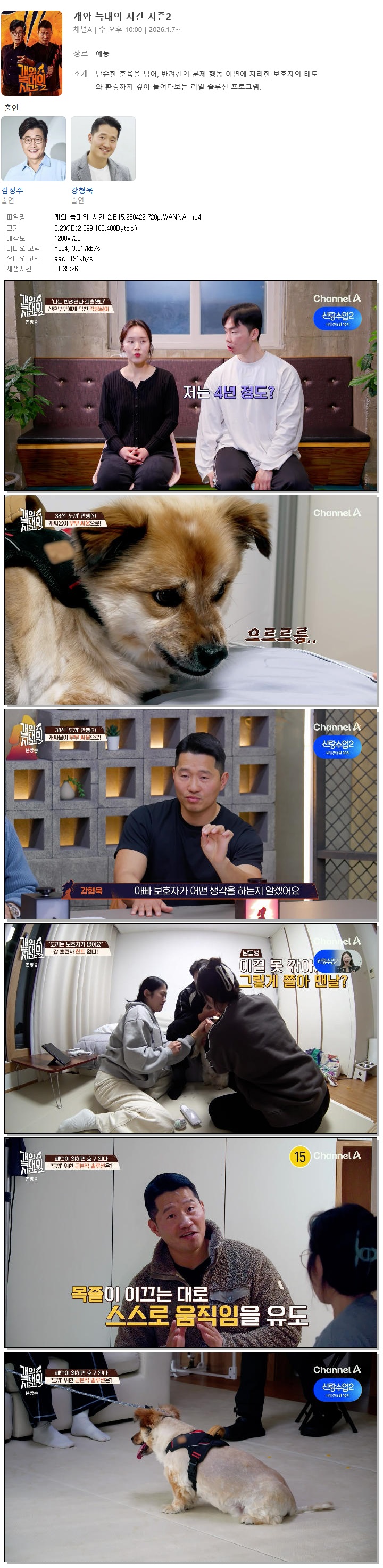 | [채널A] 개와 늑대의 시간 2.E15.260422.720p.WANNA[김성주, 강형욱].mp4 | 2.2 G | 01:39:26 | 1280x720 |