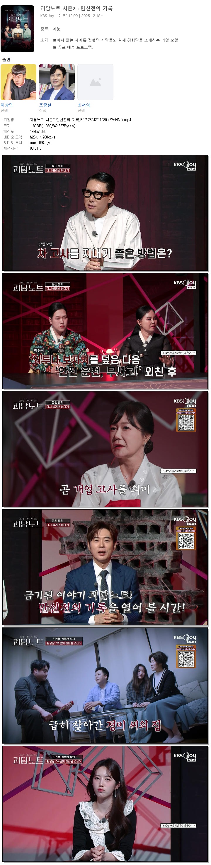 | [KBS JOY] 괴담노트 시즌2 만신전의 기록.E17.260422.1080p.WANNA[이상민, 조충현].mp4 | 1.8 G | 00:51:31 | 1920x1080 |