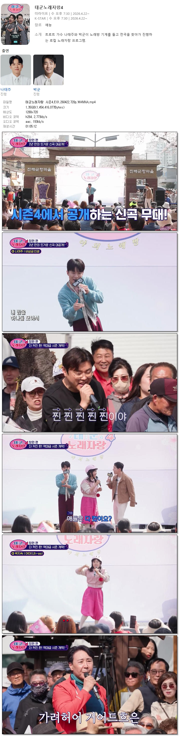| [KSTAR] 태군노래자랑 시즌4.E01.260422.720p.WANNA[나태주, 박군].mp4 | 1.4 G | 01:05:12 | 1280x720 |