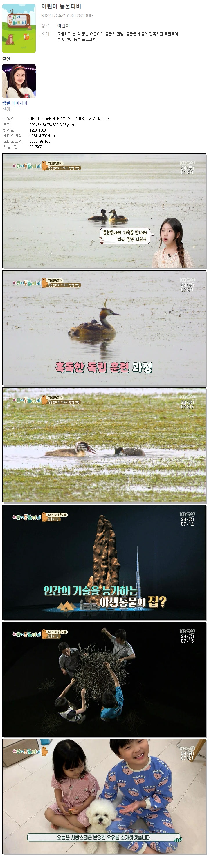 | [KBS2] 어린이 동물티비.E221.260424.1080p.WANNA[캠벨 에이시아].mp4 | 929.3 M | 00:25:58 | 1920x1080 |