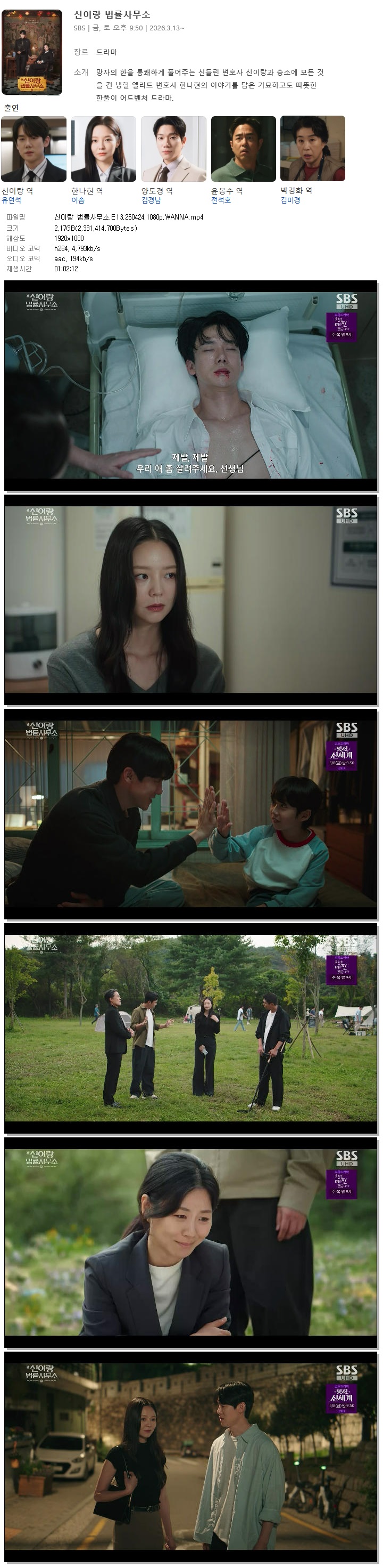| [SBS] 신이랑 법률사무소.E13.260424.1080p.WANNA[유연석, 이솜].mp4 | 2.2 G | 01:02:12 | 1920x1080 |