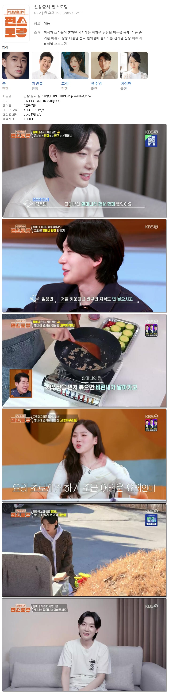 | [KBS2] 신상 출시 편스토랑.E319.260424.720p.WANNA[김용빈, 신지].mp4 | 1.6 G | 01:20:48 | 1280x720 |