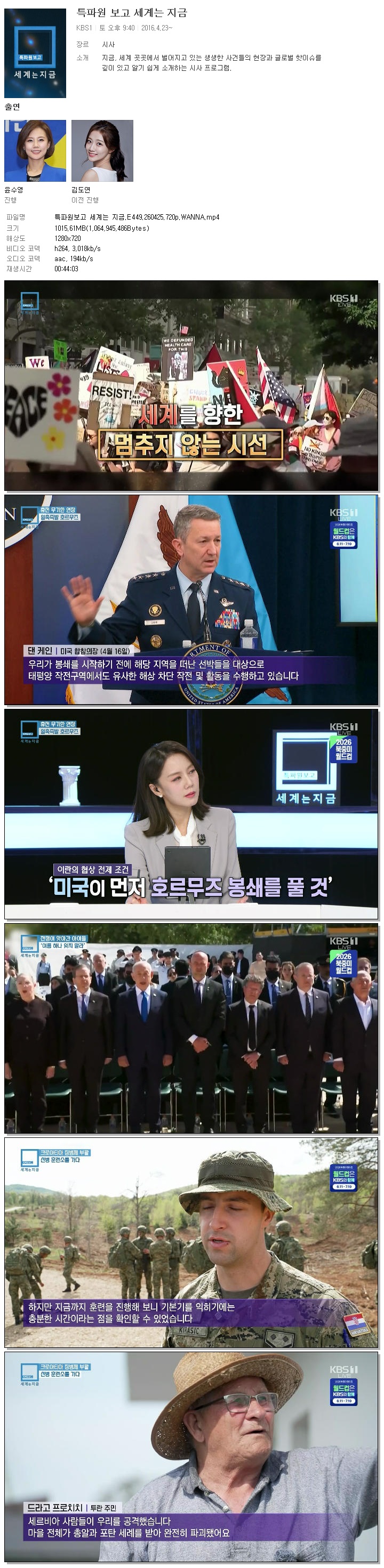 | [KBS1] 특파원보고 세계는 지금.E449.260425.720p.WANNA.mp4 | 1015.6 M | 00:44:03 | 1280x720 |