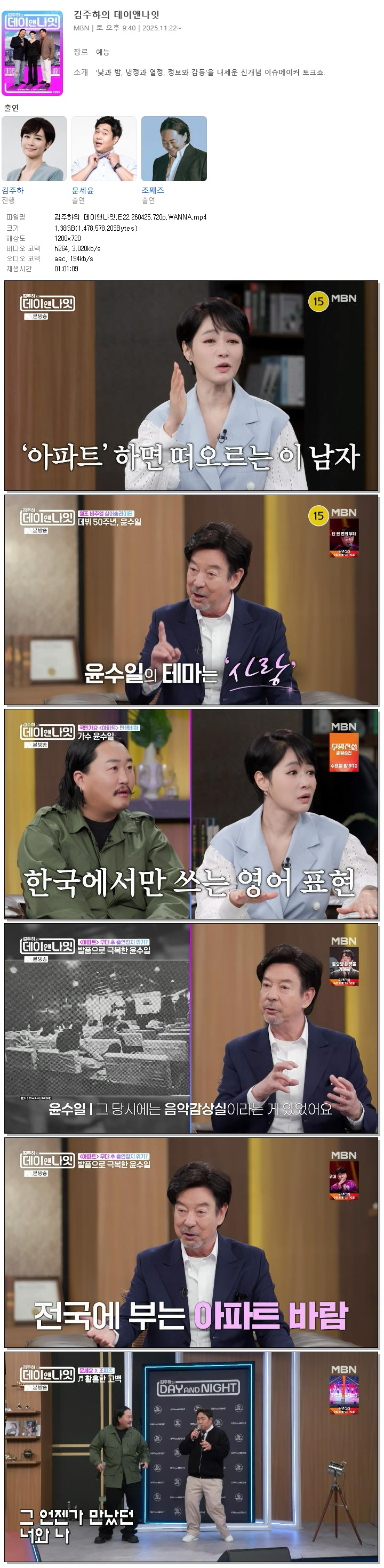 | [MBN] 김주하의 데이앤나잇.E22.260425.720p.WANNA[윤수일].mp4 | 1.4 G | 01:01:09 | 1280x720 |