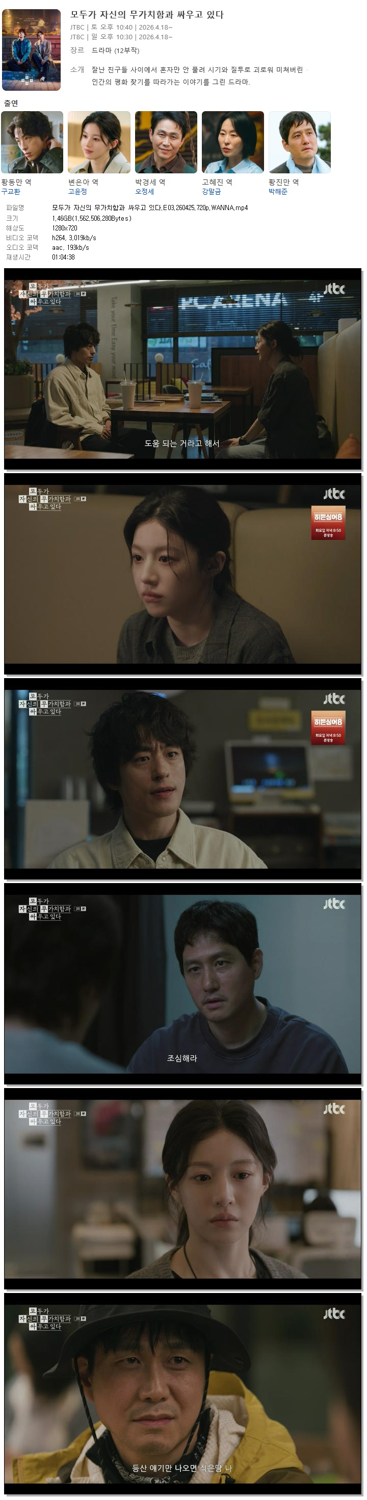 | [JTBC] 모두가 자신의 무가치함과 싸우고 있다.E03.260425.720p.WANNA[구교환, 고윤정].mp4 | 1.5 G | 01:04:38 | 1280x720 |