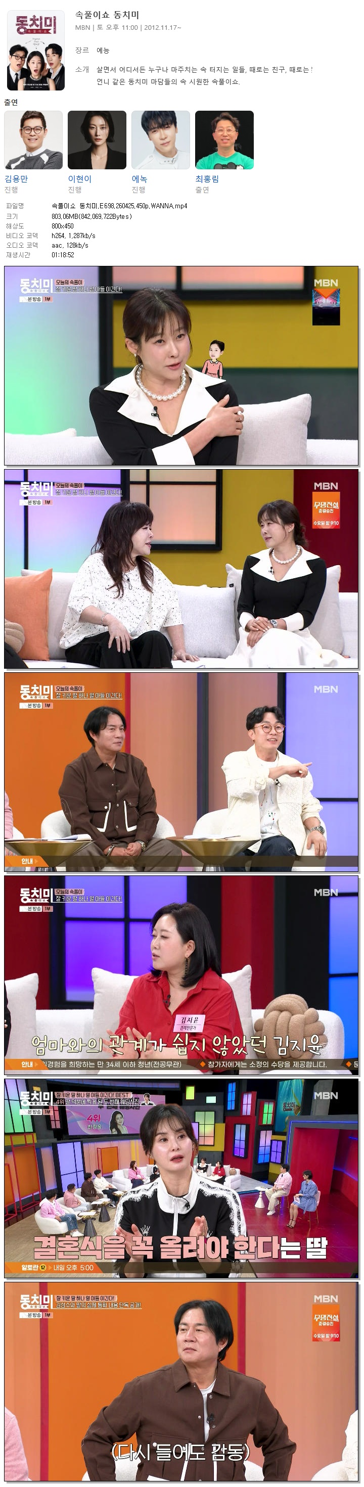| [MBN] 속풀이쇼 동치미.E698.260425.450p.WANNA[최정윤, 현영].mp4 | 803.1 M | 01:18:52 | 800x450 |