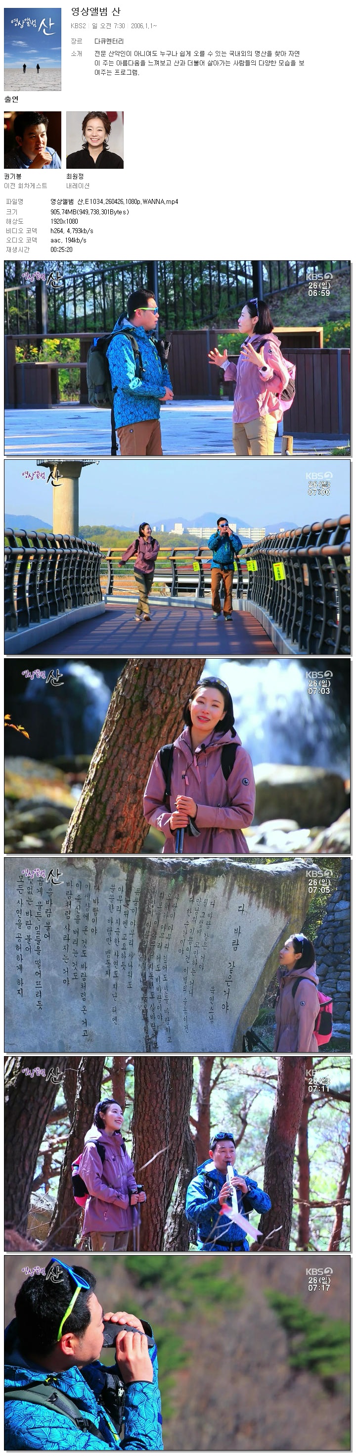 | [KBS2] 영상앨범 산.E1034.260426.1080p.WANNA.mp4 | 905.7 M | 00:25:20 | 1920x1080 |