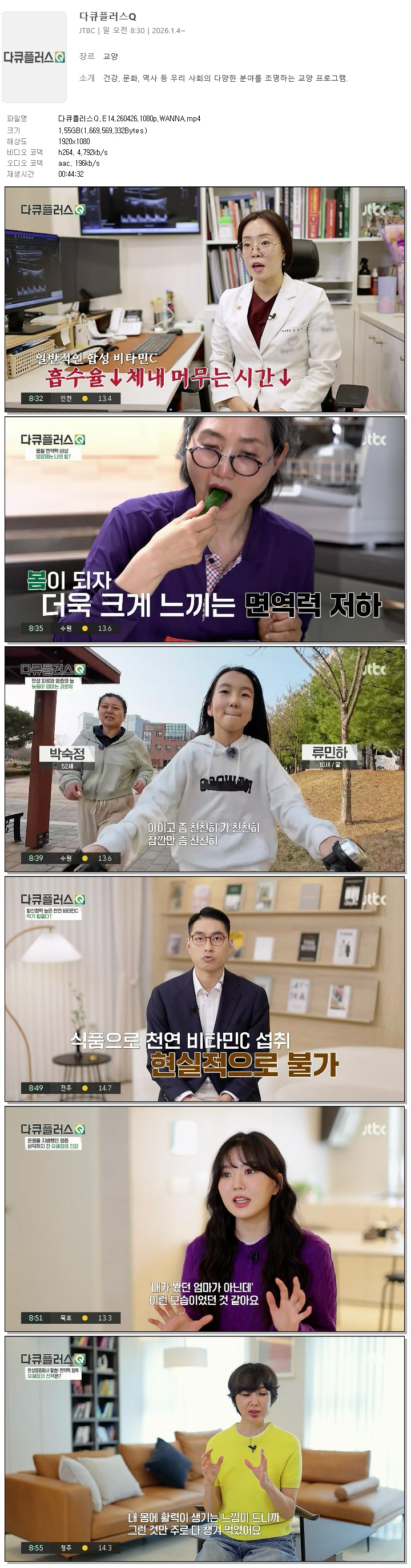 | 다큐플러스Q.E14.260426.1080p.WANNA.mp4 | 1.6 G | 00:44:32 | 1920x1080 |
