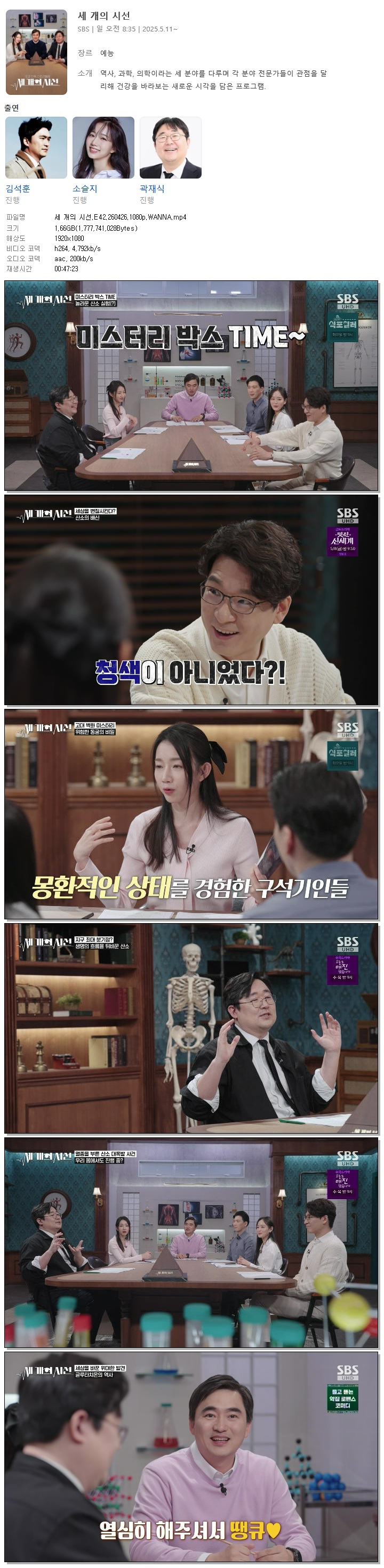 | [SBS] 세 개의 시선.E42.260426.1080p.WANNA[김석훈, 소슬지].mp4 | 1.7 G | 00:47:23 | 1920x1080 |