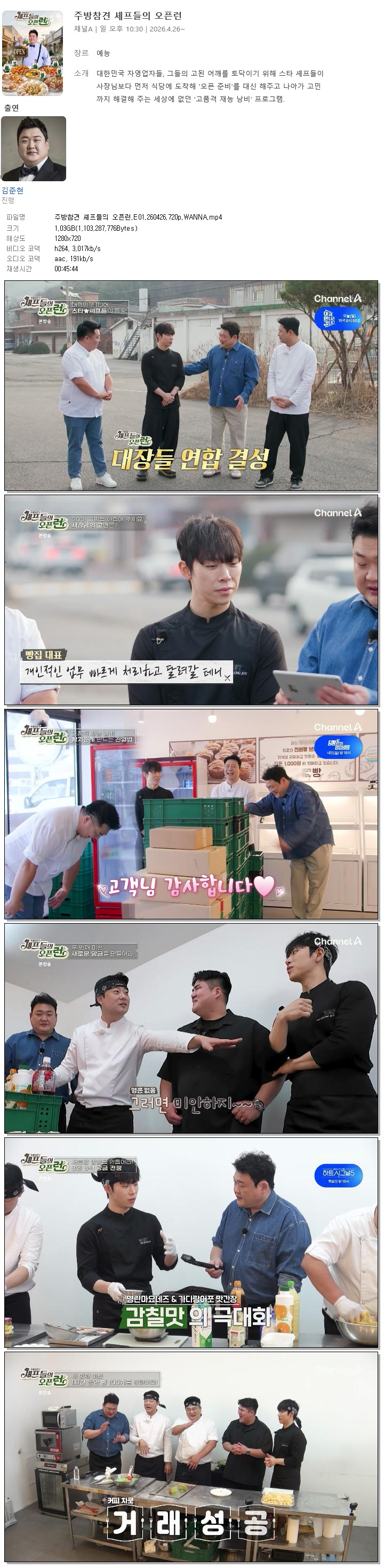 | [채널A] 주방참견 셰프들의 오픈런.E01.260426.720p.WANNA[김준현].mp4 | 1 G | 00:45:44 | 1280x720 |