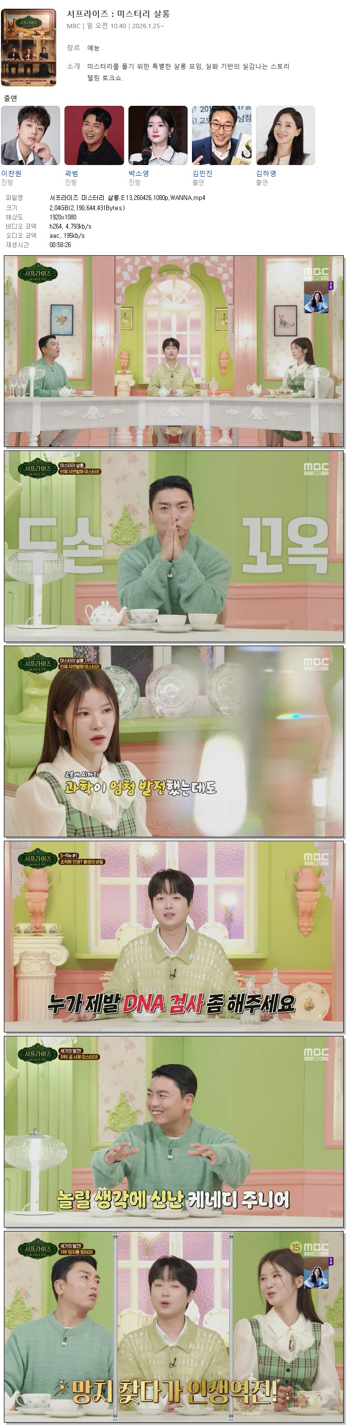 | [MBC] 서프라이즈 미스터리 살롱.E13.260426.1080p.WANNA[이찬원, 곽범].mp4 | 2 G | 00:58:26 | 1920x1080 |