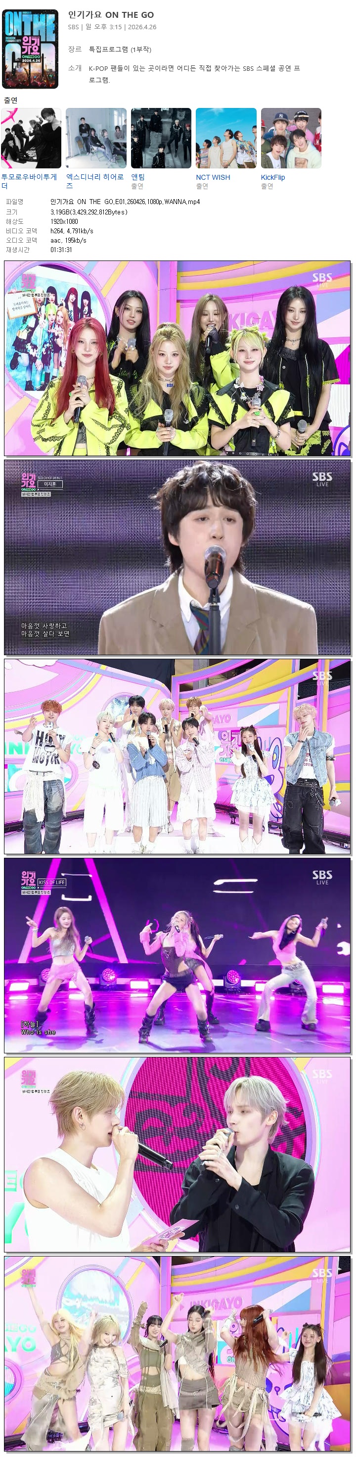 | [SBS] 인기가요 ON THE GO.E01.260426.1080p.WANNA[NCTWISH, 킥플립].mp4 | 3.2 G | 01:31:31 | 1920x1080 |