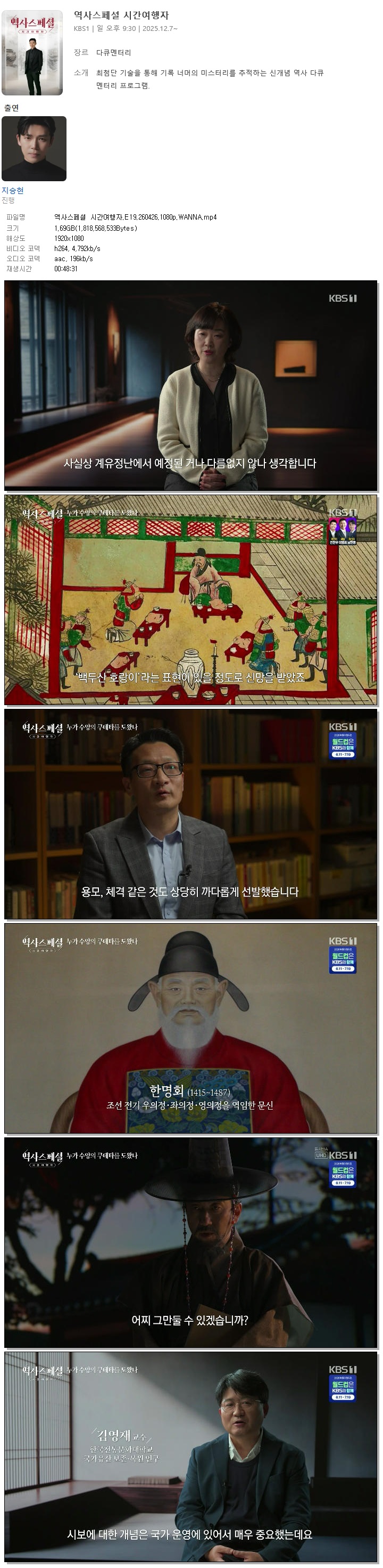 | [KBS1] 역사스페셜 시간여행자.E19.260426.1080p.WANNA[지승현].mp4 | 1.7 G | 00:48:31 | 1920x1080 |