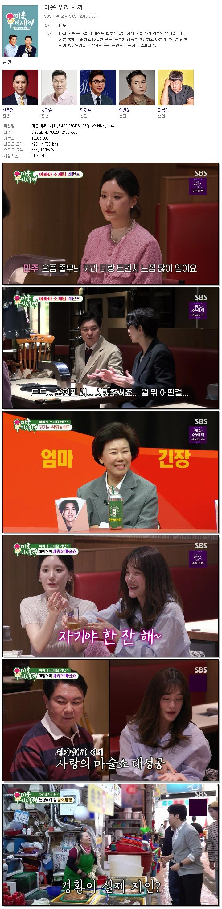 | [SBS] 미운 우리 새끼.E492.260426.1080p.WANNA[차태현, 임원희].mp4 | 3.9 G | 01:51:50 | 1920x1080 |