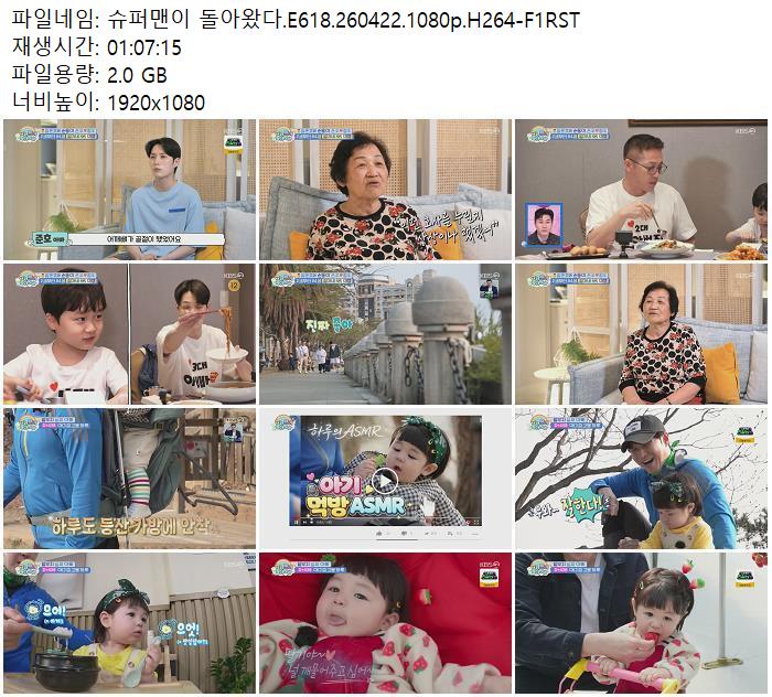 | 슈퍼맨이 돌아왔다.E618.260422.1080p.H264-F1RST.mp4 | 2 G | - | 1920x1080 |