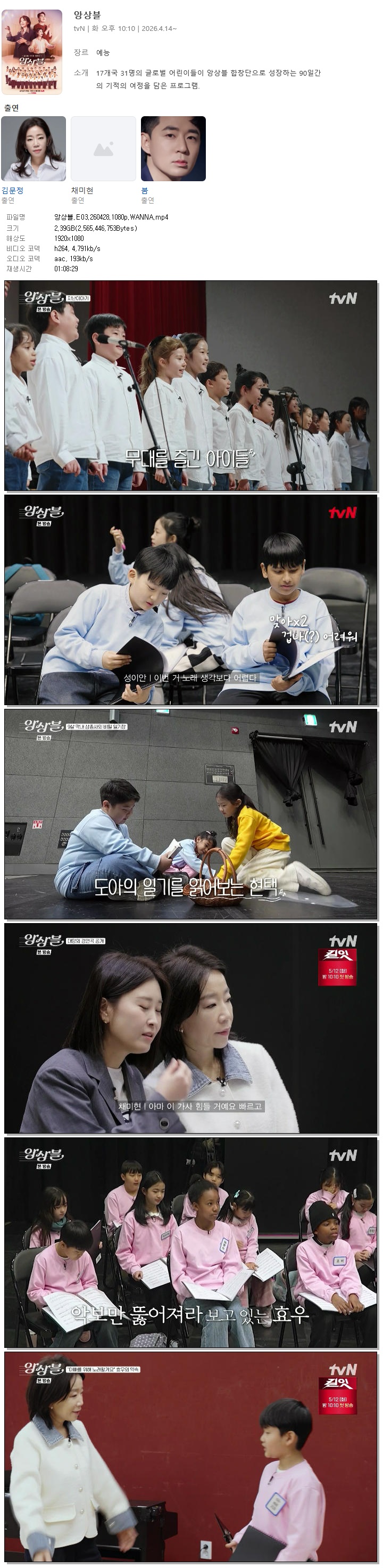 | [TVN] 앙상블.E03.260428.1080p.WANNA[김문정, 채미현].mp4 | 2.4 G | 01:08:29 | 1920x1080 |