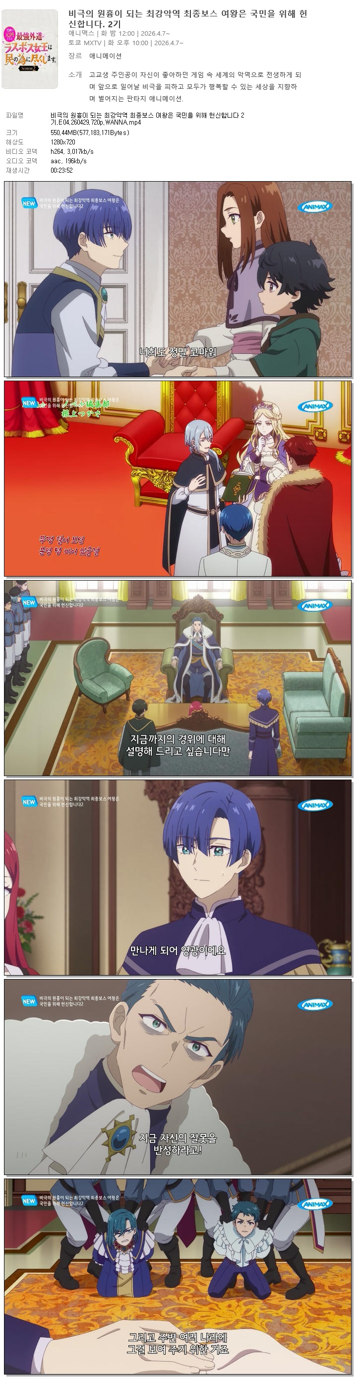 | 비극의 원흉이 되는 최강악역 최종보스 여왕은 국민을 위해 헌신합니다 2기.E04.260429.720p.WANNA.mp4 | 550.4 M | 00:23:52 | 1280x720 |