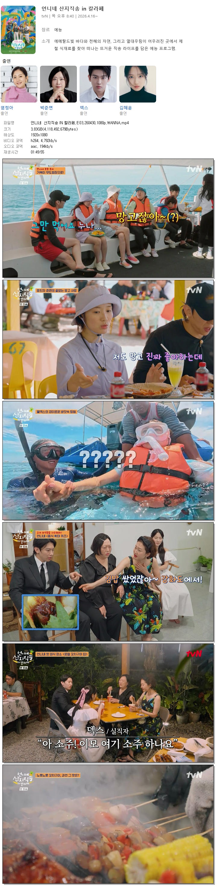 | [TVN] 언니네 산지직송 IN 칼라페.E03.260430.1080p.WANNA[덱스, 김혜윤].mp4 | 3.8 G | 01:49:55 | 1920x1080 |