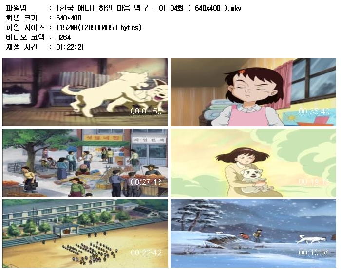 | [한국 애니] 하얀 마음 백구 - 01-04화 ( 640x480 ).mkv | 1.1 G | 01:22:21 | 640x480 |