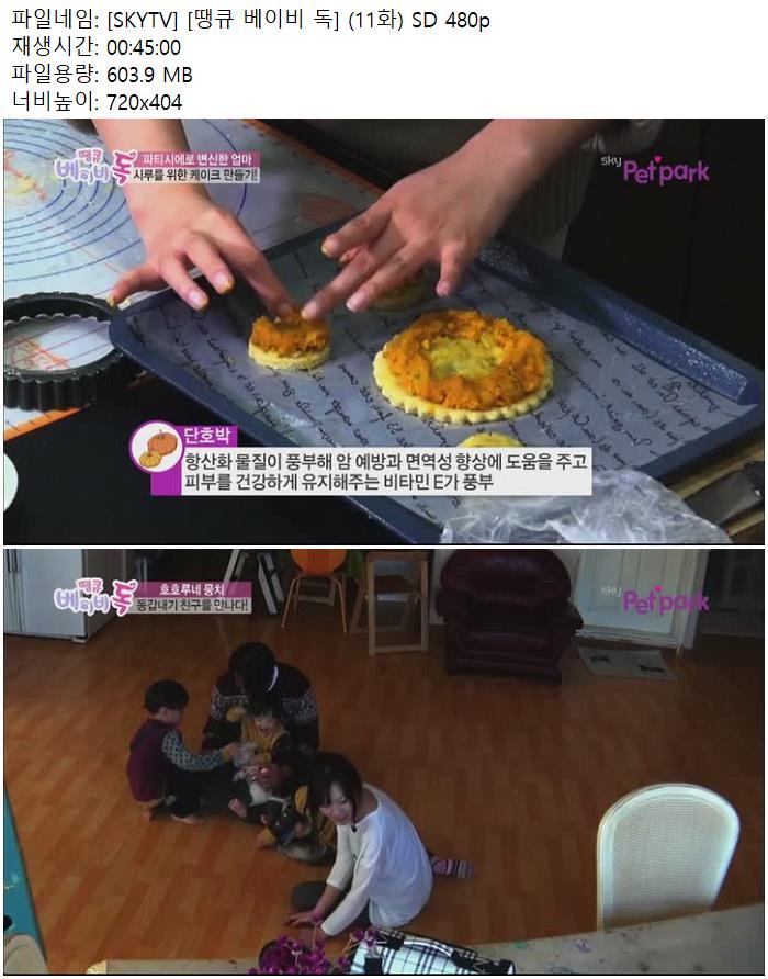 | [SKYTV] [땡큐 베이비 독] (11화) SD 480p.mp4 | 603.9 M | 00:45:00 | 720x404 |