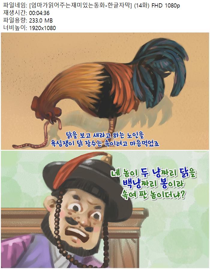 | [엄마가읽어주는재미있는동화-한글자막] (14화) FHD 1080p.mp4 | 233 M | 00:04:36 | 1920x1080 |