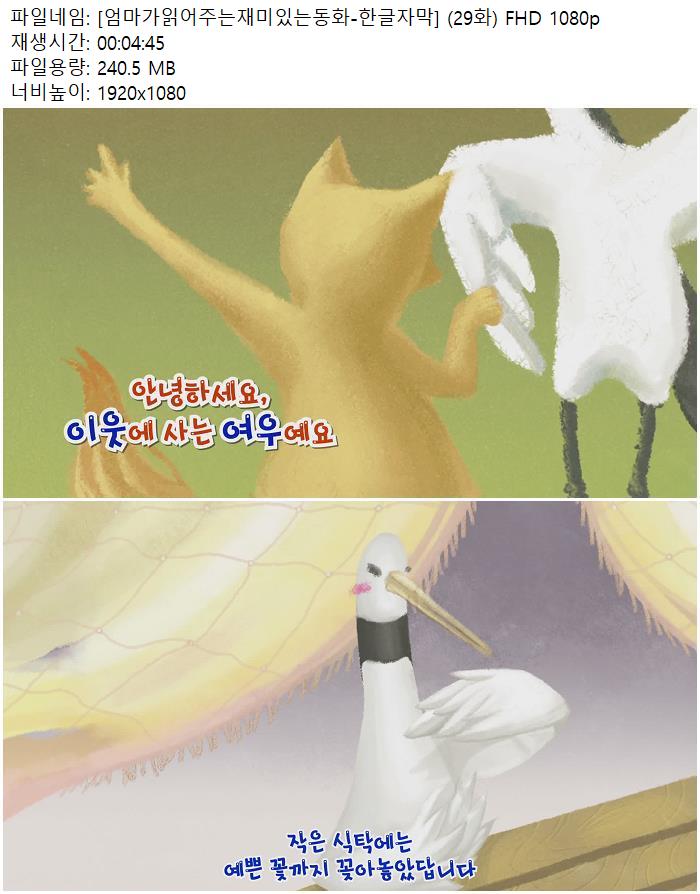 | [엄마가읽어주는재미있는동화-한글자막] (29화) FHD 1080p.mp4 | 240.5 M | 00:04:45 | 1920x1080 |