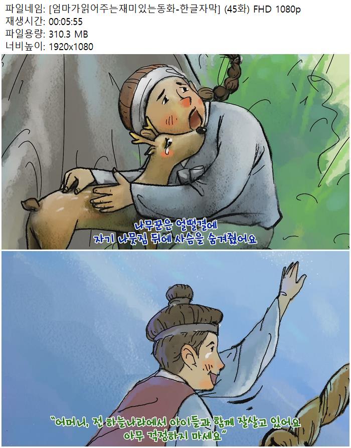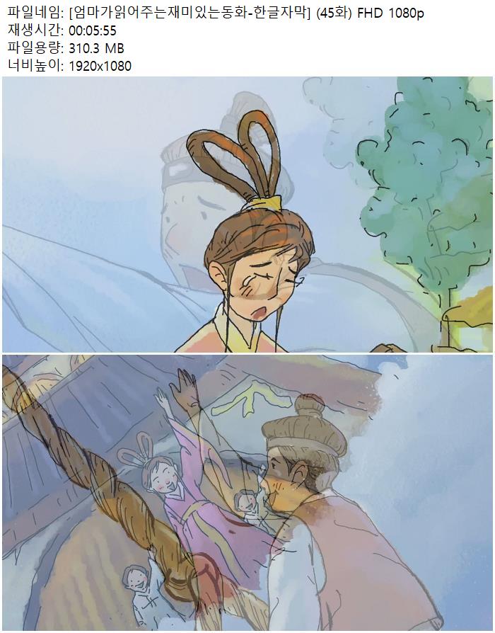 | [엄마가읽어주는재미있는동화-한글자막] (45화) FHD 1080p.mp4 | 310.3 M | 00:05:55 | 1920x1080 |