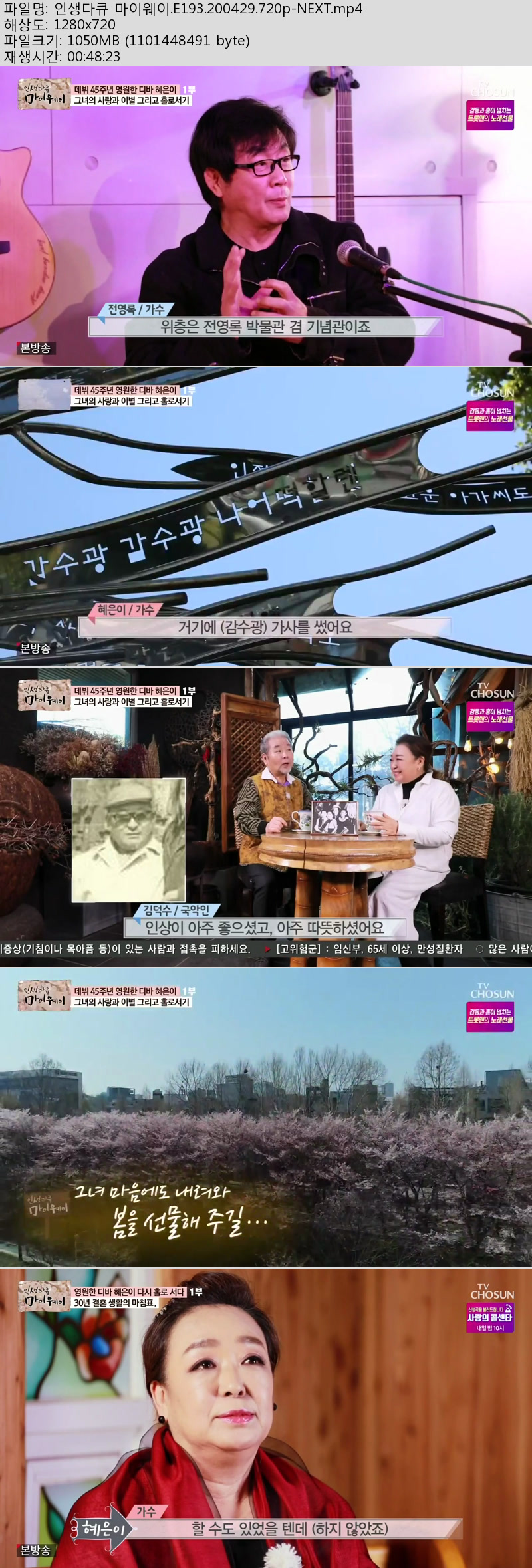 | 인생다큐 마이웨이.E193.200429.720p-NEXT.mp4 | 1 G | - | 1280x720 |