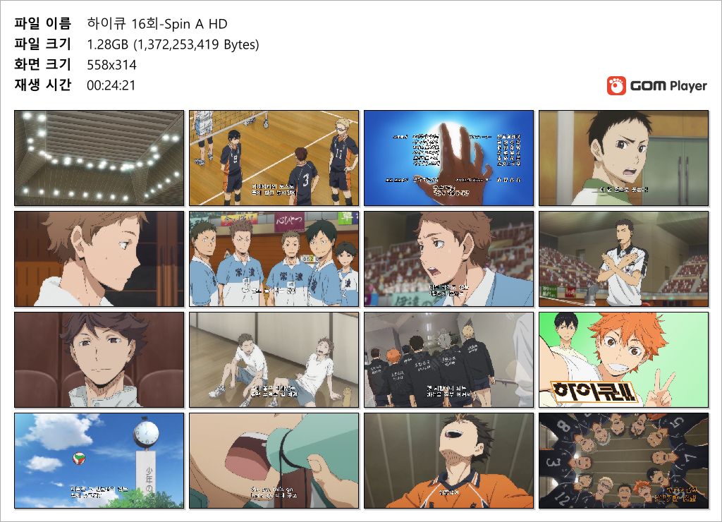 | 하이큐 16회-Spin A HD.mp4 | 1.3 G | 00:24:21 | 1920x1080 |