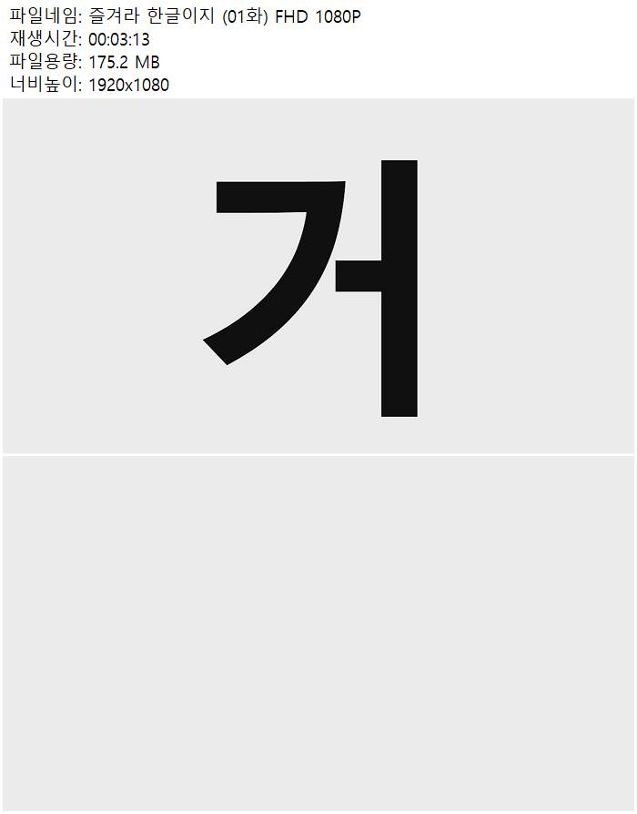 | 즐겨라 한글이지 (01화) FHD 1080P.mp4 | 175.2 M | 00:03:13 | 1920x1080 |