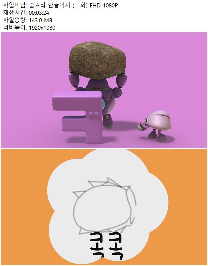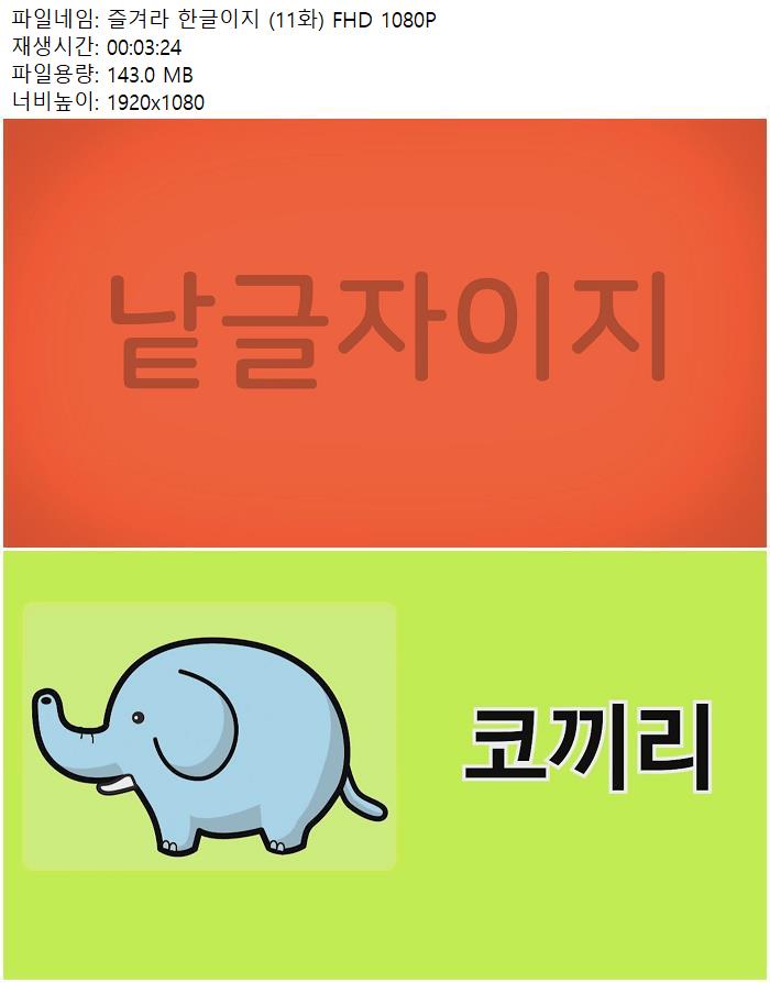 | 즐겨라 한글이지 (11화) FHD 1080P.mp4 | 143 M | 00:03:24 | 1920x1080 |