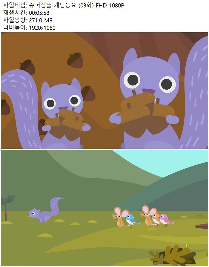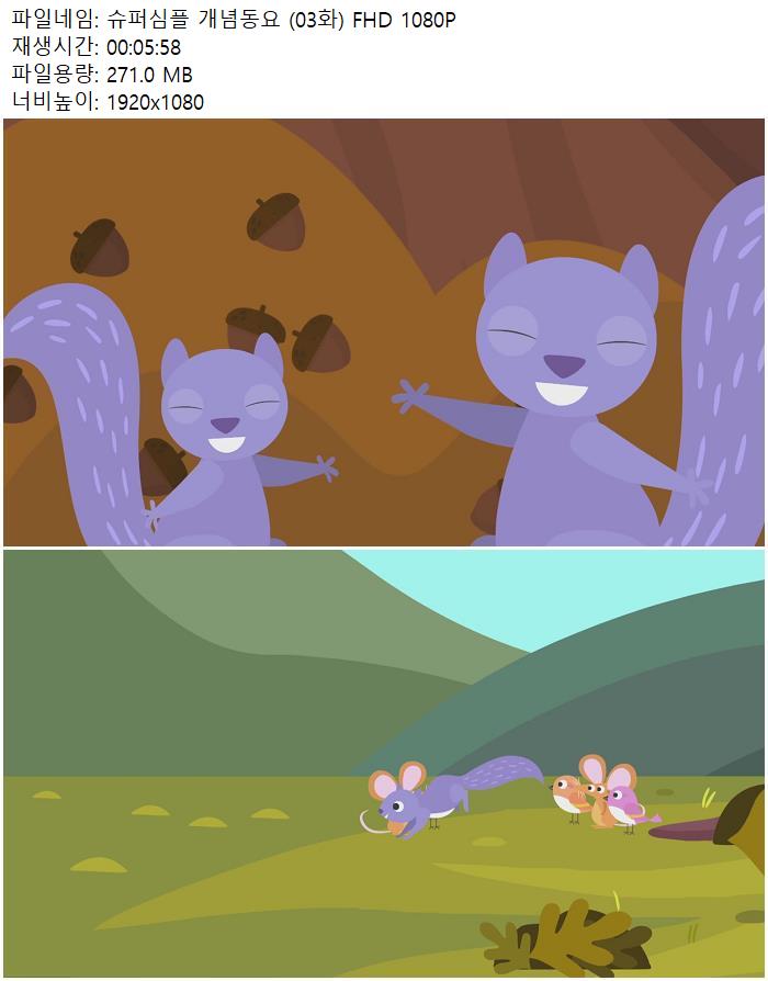 | 슈퍼심플 개념동요 (03화) FHD 1080P.mp4 | 271 M | 00:05:58 | 1920x1080 |