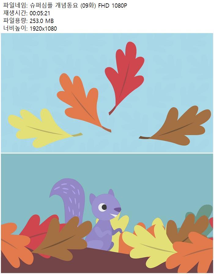 | 슈퍼심플 개념동요 (09화) FHD 1080P.mp4 | 253 M | 00:05:21 | 1920x1080 |