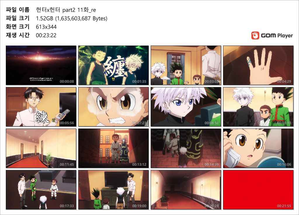 | 헌터x헌터 part2 11화_re.mp4 | 1.5 G | 00:23:22 | 1280x720 |