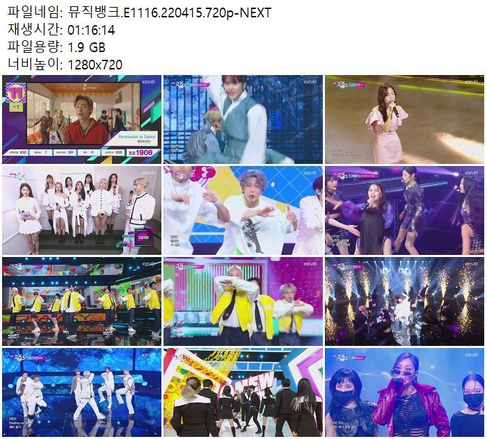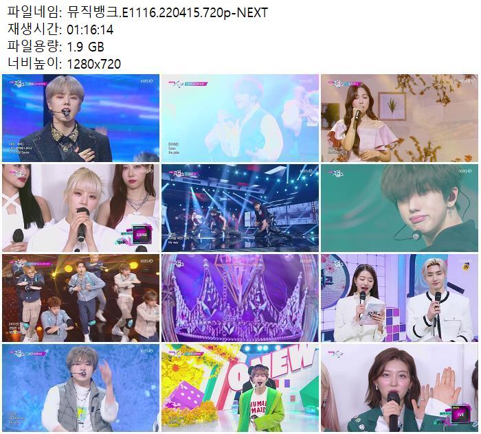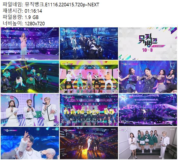 | 뮤직뱅크.E1116.220415.720p-NEXT.mp4 | 1.9 G | 01:16:14 | 1280x720 |